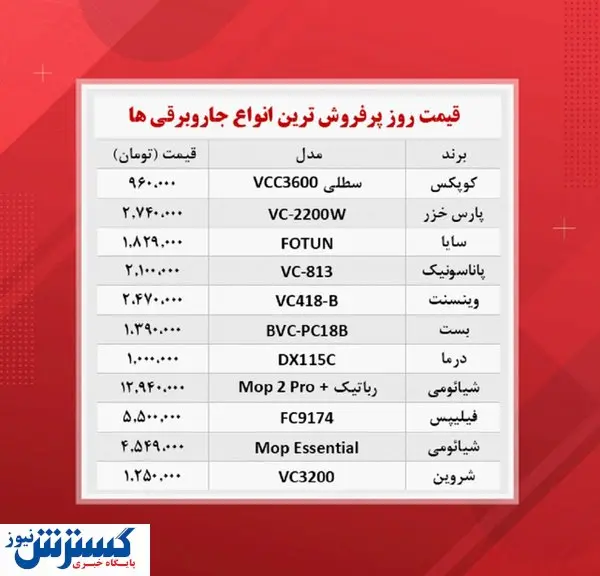 آنچه در زیر میآید جدول قیمت جدید انواع پرفروشترین جاروبرقی ها در سایتهای فروش اینترنتی است؛