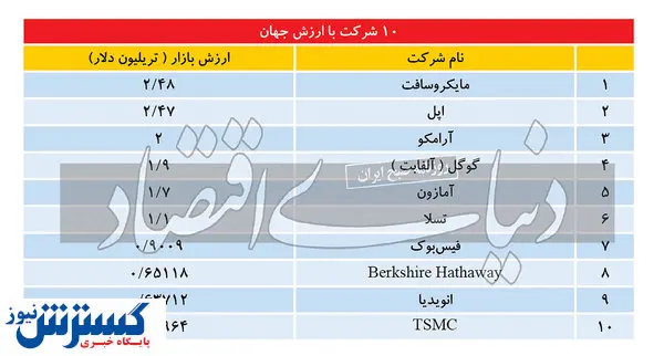 مایکروسافت ارزشمندترین شرکت جهان شناخته شد. پیشتر اپل به پشتوانه فروش آیفون سالها عنوان ارزشمندترین شرکت جهان را در اختیار داشت، حالا به دنبال پیشبینی کاهش اقبال بازار به این گوشی و بعد از یازده سال، جایگاهش را از دست داده است. روز جمعه عملکرد مثبت مالی مایکروسافت، به رشد قیمت سهام آن منجر شد و ارزش بازار این شرکت به ۴۹/ ۲تریلیون دلار رسید.