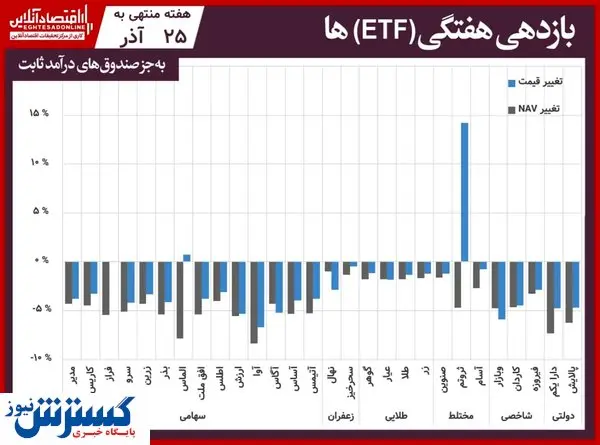 در چهارمین هفته آذر ماه، صندوقهای ETF سهامی به طور متوسط، افت ۳.۸درصدی را ثبت کردند و صندوقهای مبتنی بر طلا، با کاهش ۱.۴درصدی قیمت به کار خود پایان دادند.