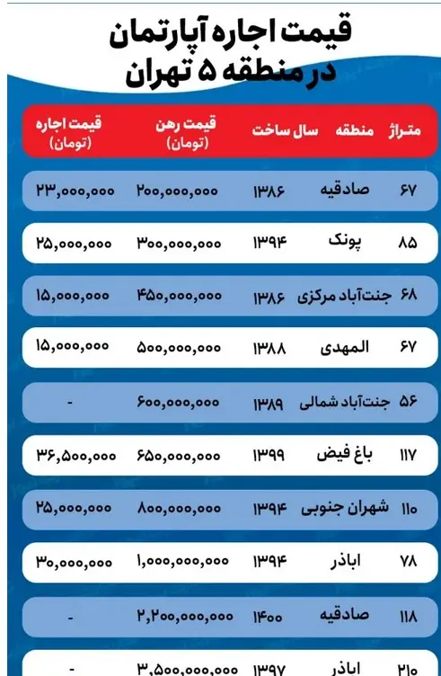 بررسی آگهیهای رهن و اجاره مسکن در منطقه پنج تهران نشان میدهد که خانههای این منطقه، با ارقام بالایی به اجاره گذاشته شدهاند. با این حال، مبلغ ودیعه، بسته به محله و میزان اجاره ماهانه بسیار متغیر است.