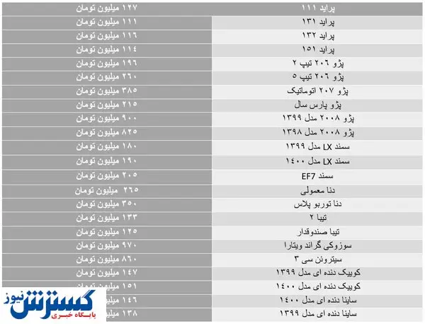 در خصوص خودروهای پژو اما مسیر حرکت بیشتر خودروهای این گروه طی ۲۴ ساعت گذشته کاهشی بوده است به طوری که پژو ۲۰۷ اتوماتیک طی ۲ ساعت گذشته ۲ میلیون تومان ارزان شده است و درحالحاضر به نرخ ۳۸۵ میلیون تومان رسیده است و پژو ۲۰۰۸ مدل ۹۸ نیز در این مدت ۵ میلیون تومان دیگر ارزان شده است و درحالحاضر ۸۲۵ میلیون تومان نرخ دارد و پژو پارس ساده مدل ۹۹ نیز در حالی امروز ۳ میلیون تومان ارزان شده است که این خودرو در روزهای گذشته ثبات نرخ داشته است؛ پژو پارس ساده مدل ۹۹ درحالحاضر به نرخ ۲۱۵ میلیون تومان رسیده است.