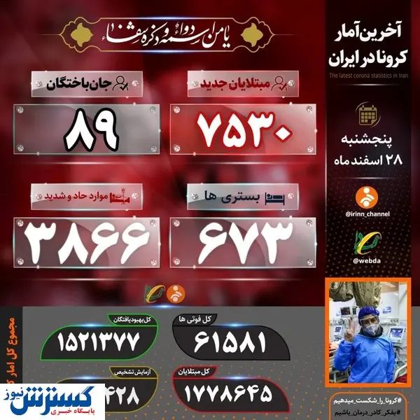 آخرین آمار کرونا در ایران سه شنبه ۱۳۹۹/۱۲/۲۸