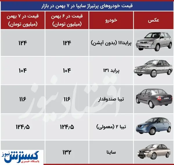 قیمت خودروهای سایپا (۹۹/۱۱/۰۷) + جدول