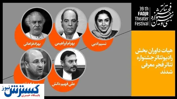 بهرام ابراهیمی، نسیم ادبی، بهزاد فراهانی، علی فهیم دانش و شهرام گیل آبادی مسئولیت داوری رادیوتئاترهای جشنواره تئاتر فجر را برعهده گرفتند.