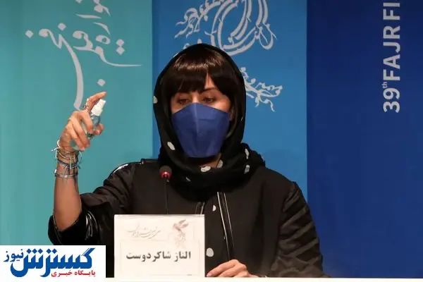 تصویری از الناز شاکردوست در حال ضدعفونی کردن میکروفون خود در نشست خبری جشنواره فجر منتشر شده است.