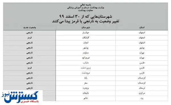 همچنین شهرستانهای خوانسار، لنجان، بوشهر، دماوند، فیروزکوه، داراب، مرودشت، بانه، سقز، بروجرد و دلیجان در وضعیت نارنجی قرار گرفتند. لذا محدودیتهای تردد در این شهرستانها برقرار میشود.
