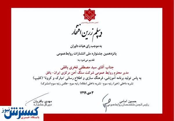 دیپلم زرین افتخار به روابط عمومی سنگ آهن مرکزی بافق رسید