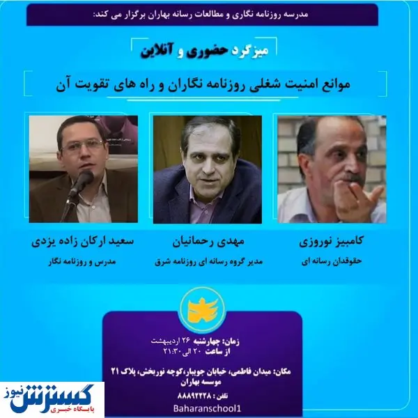 مدرسه روزنامه نگاری و مطالعات رسانه بهاران میزگردی با عنوان«موانع امنیت شغلی روزنامه نگاران و راه های تقویت آن »با حضور مهدی رحمانیان مدیر مسئول روزنامه شرق، کامبیز نوروزی حقوقدان رسانه ای و سعید ارکان زاده یزدی مدرس و روزنامه نگار به صورت آنلاین و حضوری برگزار می کند.
