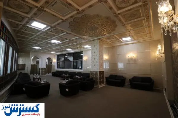 گچ بری های ظریف، کاشیکاری های استادانه و به کارگیری نقوش طلایی در ستون ها و قوس ها جلوه ای فاخر از هنر ایرانی اسلامی را پیش چشم مخاطبین عیان می کند. میزهای پذیرش (counter) هم از جنس چوب ساخته شده و با طرحهای گرهچینی تزیین شدهاند. فضای پشت این میزهای پیشخوان به گونه ای هنرمندانه به واسطه هنر گره چینی و کاربست فلز و کاشی های هفت رنگ تزیین شده است. در سقف اتاق کنفرانس نیز هنر گرهچینی با فلز به کارگرفته رفته و تزیینات آن نیز با بهره گیری از کاشیهای هفترنگ و گچبری های استادانه انجام شده است و فضایی منحصر به فرد و چشم¬نواز را برای مخاطبین خلق کرده است.