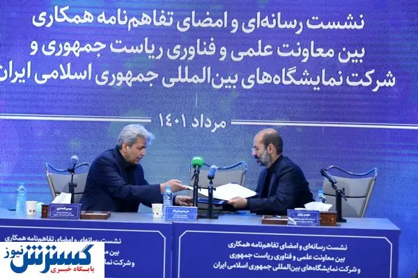 مراسم امضای تفاهم نامه همکاری میان معاونت علمی و فناوری ریاست جمهوری و شرکت سهامی نمایشگاه های بین المللی ایران امروز سه شنبه ۱۱ مرداد ماه با حضور مهدی قلعه نوی رییس مرکز تعاملات بین المللی علم و فناوری معاونت علمی و فناوری ریاست جمهوری، علیرضا پیمان پاک معاون وزیر صمت و رییس سازمان توسعه تجارت و هومن رازدار مدیرعامل شرکت سهامی نمایشگاه های بین المللی ایران در محل سایت تهران برگزار شد.