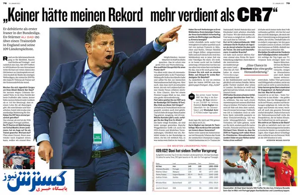 علی دایی اسطوره فوتبال ایران که اخباری پیرامون حضورش در لیگ جزیره و باشگاه اورتون نیز مخابره شده بود و حالا در آستانه از دست دادن رکورد تاریخی آقای گل فوتبال جهان در عرصه ملی است، در مصاحبهای با نشریه «کیکر» آلمان درباره موضوع رکوردشکنی احتمالی کریستیانو رونالدو، پیشنهاد باشگاه اورتون، اوضاع و احوال فوتبال ایران و... صحبت کرده است؛ مشروح مصاحبه علی دایی و نشریه کیکر را در ادامه میخوانید: