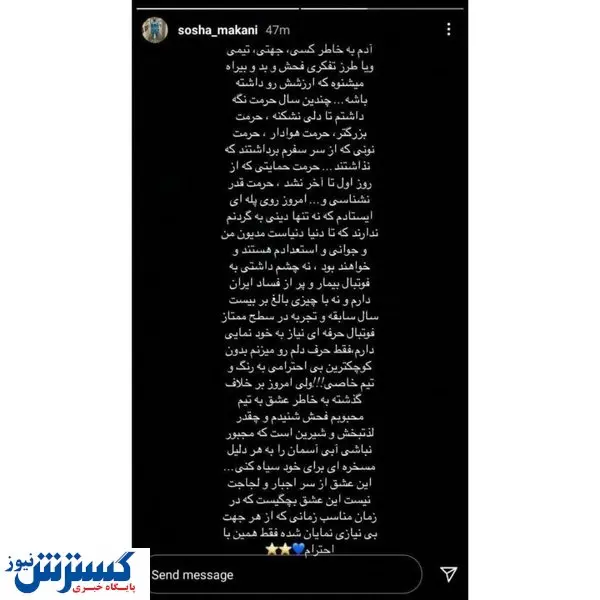 واکنش به حواشی اخیر و توضیح سوشا مکانی دروازهبان سابق پرسپولیس درباره تیم محبوب خود در اینستاگرام