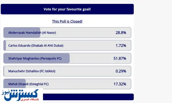 گل عبدالرزاق حمدلله مقابل فولاد با کسب ۲۸.۸ در رده دوم جای گرفت و گل مهدی قائدی مقابل الدحیل با کسب ۱۷.۳۲ درصد آراء به رده سوم رسید.