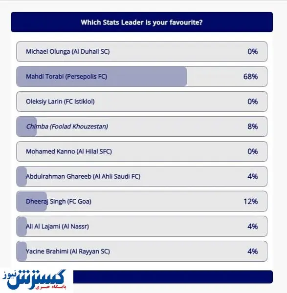 وب سایت کنفدراسیون فوتبال آسیا با ارائه آمار فردی بهترین بازیکنان لیگ قهرمانان در هر بخش، اقدام به برپایی یک نظرسنجی کرده است.