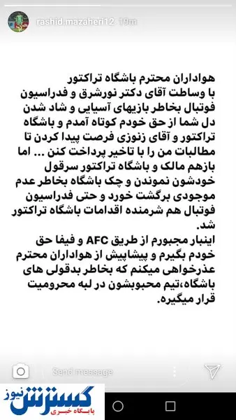 سنگربان استقلال امروز با انتشار یک استوری در صفحه شخصی خود، خبر داد که به زودی از تراکتور و در نزد کنفدراسیون فوتبال آسیا شکایت می کند. در استوری مظاهری آمده است: