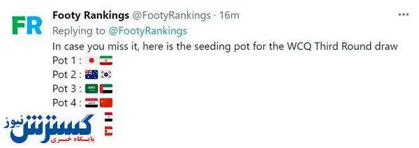 به نظر میرسد باتوجه به نتایج تیمهای ملی در چند بازی اخیر، فیفا در رنکینگ تازه اش، تغییراتی را اعمال کند. صفحه توییتر Footy Rankings در توییتی سیدبندی مدنظر خود را با توجه به نتایج رقم خورده در بازیهای اخیر و احتمالات برای جابجایی تیمها در جدول فیفا را به نوع دیگری اعلام کرد. در این صفحه سیدهای یک و دو بدون تغییر هستند و ایران و ژاپن در گلدان اول قرار دارند و با هم رو به رو نخواهند شد. در سید دوم استرالیا و کره هستند که با یکی از این دو تیم سر سخت دیدار خواهیم کرد.