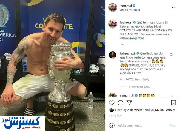 تصویر منتشر شده توسط «لیونل مسی» در حساب کاربری اینستاگرام وی پس از قهرمانی در کوپا امریکای امسال، با گذر از مرز ۲۰ میلیون لایک، به محبوبترین تصویر ورزشی این پلتفرم بدل شد.مسی به تازگی به همراه آلبی سلسته موفق شد با پیروزی یک بر صفر برابر برزیل در فینال کوپا امریکا، نخستین جام بینالمللی خود را بالای سر ببرد.