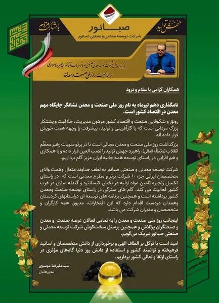 مدیرعامل شرکت معدنی وصنعتی صبا نور درپیامی روز ملی صنعت و معدن راتبریک گفتند: