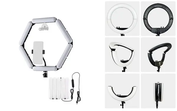 رینگ لایتهای شکل پذیر، همانطور که در تصویر بالا میبینید، قطعاتی جدا از هم دارند که میتوان آنها را شکل داد و به صورت چند ضلعی، دایره، نیمدایره، دایره کامل، مثلث یا مربع تنظیم کرد.