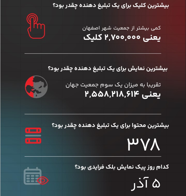 در بلک فرایدی 1404، رکورد بیشترین نمایش برای یک تبلیغدهنده به عدد خیرهکننده ۲,۵۵۸,۲۱۸,۶۱۴ رسید. این عدد بهتنهایی نشان میدهد رقابت برندها از سطح «دیده شدن» عبور کرده و به نبردی برای «ماندن در ذهن» تبدیل شده است. از سوی دیگر، ثبت بیش از ۲.۷ میلیون کلیک برای یک تبلیغدهنده، نشان میدهد که پیامها فقط نمایش داده نشدهاند، بلکه توانستهاند کاربر را به تعامل وادار کنند؛ نقطهای که بسیاری از کمپینها در آن شکست میخورند.