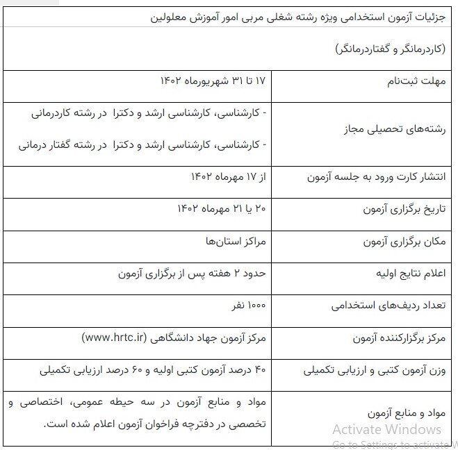 رئیس سازمان آموزش و پرورش استثنایی در خصوص استخدام جدید وزارت آموزش و پرورش گفته بود: از جمعه ۱۷ شهریور ۱۴۰۲ فراخوان ثبتنام از طریق مرکز آزمون جهاد دانشگاهی منتشر میشود و به مدت دو هفته متقاضیان میتوانند در این آزمون ثبتنام کنند که مهلت ثبتنام تا ۳۱ شهریور است.