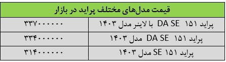 آخرین قیمت ها در بازار خودرو حاکی از آن است که قیمت پراید ۱۵۱ SE مدل ۱۴۰۳ در بازار ۱.۵ درصد ارزان شد. بر همین اساس، قیمت ۱۵۱ SE مدل ۱۴۰۳ با کاهش ۵ میلیون تومانی، به ۳۳۷ میلیون تومان رسید.