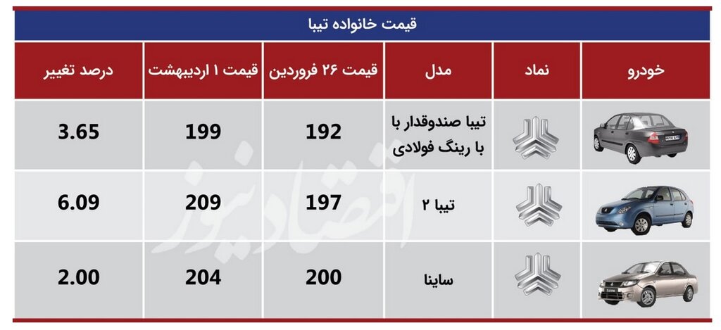 خانواده تیبا این هفته خبرساز بازار بودند. «تیبا صندوقدار» افزایش هفت میلیون تومانی قیمت را در کارنامه معاملاتی خود ثبت کرد و خود را به مرز ۲۰۰ میلیون تومان رساند. «تیبا صندوقدار» در هفته ای که پشت سر گذاشته شد ۱۹۹ میلیون تومان قیمت داشت. اما «تیبا ۲ معمولی» در آخرین روزهای فروردین ماه رکورددار گرانی شد و با ۱۲ میلیون تومان افزایش قیمت مرز ۲۰۰ میلیون تومان را پشت سر گذاشت و ۲۰۹ میلیون تومان قیمت خورد.