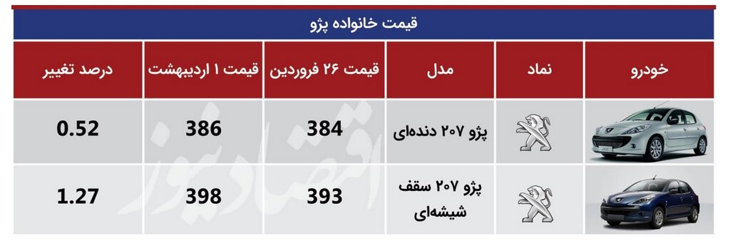 ۲۰۷ ها نیز این هفته با جریان گرانی همراهی کردند، هر دو محصول این خانواده با افزایش قیمت های ۲ و پنج میلیون تومانی هفته را به پایان رساندند. «پژو ۲۰۷ دنده ای» در آخرین روزهای فروردین ۲ میلیون تومان گران شد و ۳۸۶ میلیون تومان از سوی فعالان بازار قیمت داده شد و «پژو ۲۰۷ سقف شیشه ای» نیز با ثبت افزایش قیمت پنج میلیون تومانی ۳۹۸ میلیون تومان شد.