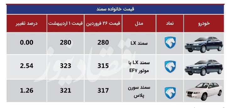 «سمند LX» تنها خودرویی بود که در هفته ای که گذشت هیچ افزایش قیمتی را ثبت نکرد و راهش را از سایر خودروها جدا کرد، با این حال سایر خودروهای این خانواده با گرانی های بازار همراه شدند. «سمند LX با موتورEF۷» در مقایسه با هفته قبل هشت میلیون تومان گران شد و ۳۲۳ میلیون تومان به فروش رسید، «سمند LX» با ثبات قیمت همچنان ۲۸۰ میلیونی بود و «سمند سورن پلاس» هم با رشد چهار میلیونی قیمت ۳۲۱ میلیون تومان قیمت گذاری شد.