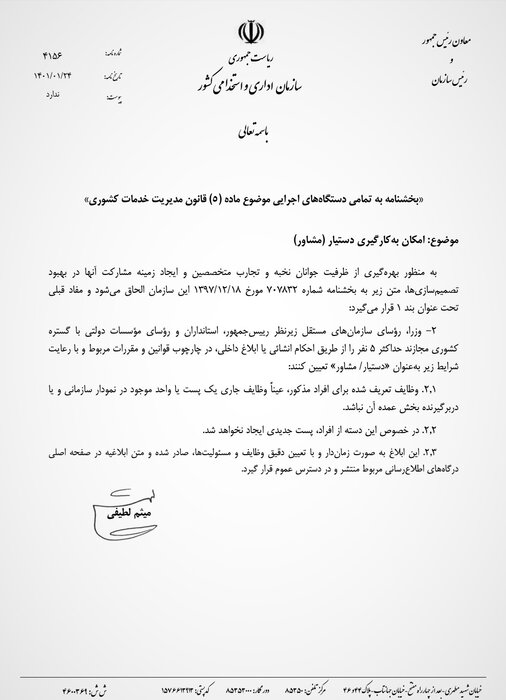 «میثم لطیفی» معاون رئیس جمهور و رئیس سازمان اداری و استخدامی کشور در بخشنامهای به دستگاههای اجرایی موضوع ماده (۵) قانون مدیریت خدمات کشوری در خصوص "امکان بهکارگیری دستیار (مشاور)" ابلاغ کرد: وزرا، رؤسای سازمانهای مستقل زیر نظر رئیسجمهور، استانداران و رؤسای مؤسسات دولتی با گستره کشوری مجازند حداکثر ۵ نفر را از طریق احکام انشائی یا ابلاغ داخلی به عنوان «دستیار» یا «مشاور» تعیین کنند.
